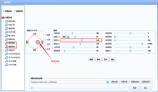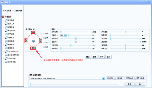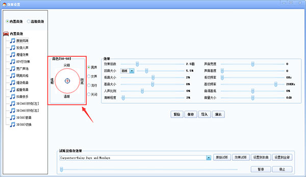 点击上图中【设置效果】,进入音效设置界面,内置音效中就有调整音色功能。