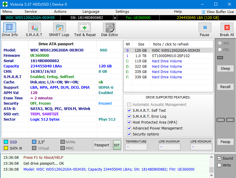 在应用程序能够分析的详细信息中,您可以找到硬盘的型号、磁盘大小、功能和总大小,但也可以找到更高级的属性,如S.M.A.R.T.属性(自我监控、分析和报告技术),包括原始读取错误率、旋转次数、查找错误或速率、启动/停止计数和通电时间。