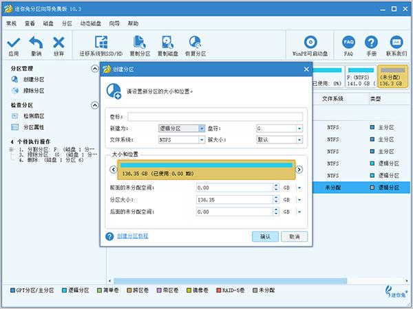 1、选择“创建分区”功能:选择未分配的空间后,单击左侧菜单中的“创建分区”。