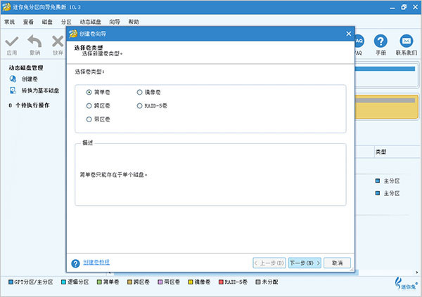2、在弹出窗口中选择要创建的卷类型。功能强大的服务器分区软件可以根据实际情况列出所有支持的类型。