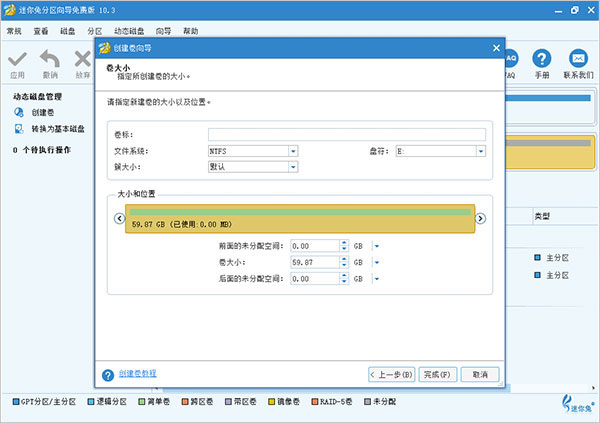 4、为新创建的卷设置相关参数,包括卷标,文件系统,驱动程序字母,群集大小和卷大小/位置然后单击“完成”按钮返回软件的主界面;
