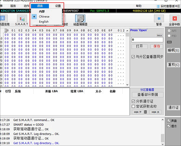 1、打开victoria硬盘修复工具,在上方菜单栏中选择language下面的中文;