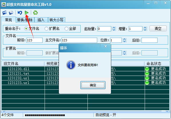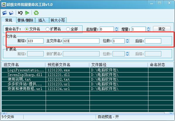 1、支持批量插入文字、插入序号、替换字符、文件名转大小写等,插入位置可随意控制。