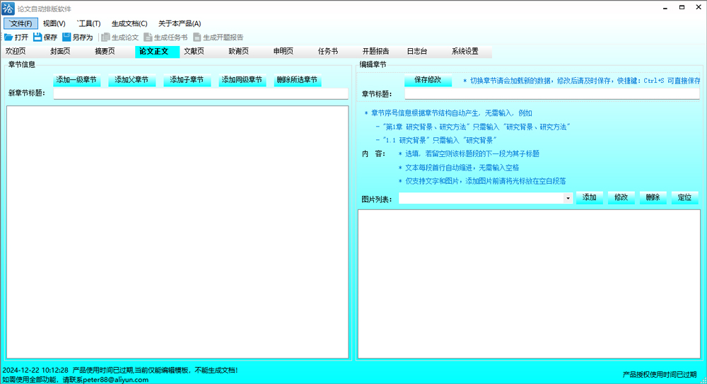 4、支持录入文字和图片,章节序号、参考文献序号、图片的序号不用输入,本软件会自动实时生成。