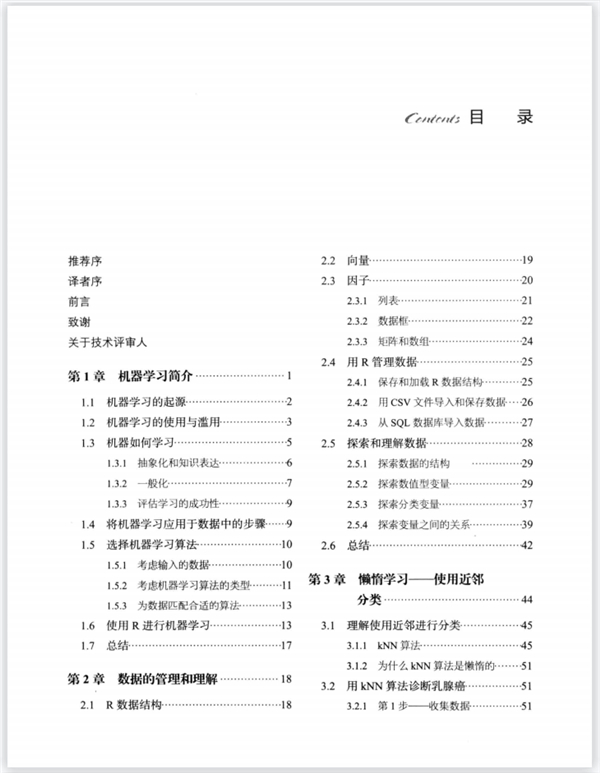 《机器学习与R语言》涵盖的内容第1章介绍了用来定义和区分机器学习算法的术语和概念,并给出了将学习任务与适当算法相匹配的方法。第2章介绍如何应用R来管理数据,进行数据的探索分析和数据可视化;第3~9章介绍典型的机器学习算法,包括k近邻分类算法、朴素贝叶斯算法、决策树和规则树、回归预测、黑盒算法——神经网络和支持向量机、关联分析、k均值聚类,并给出大量的实际案例和详细的分析步骤,例如乳腺癌的判断、垃圾短信的过滤、贷款违约的预测、毒蘑菇的判别、医疗费用的预测、建筑用混凝土强度的预测、光学字符的识别、超市购物篮关联分析以及市场细分等;第10章介绍模型性能评价的原理和方法;第11章给出提高模型性能的几种常用方法;第12章讨论用R进行机器学习时可能遇到的一些高级专题,如特殊形式的数据、大数据集的处理、并行计算和GPU计算等技术。章节目录