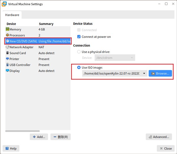 我们在“新CD/DVD(SATA)”处选择我们的镜像文件。