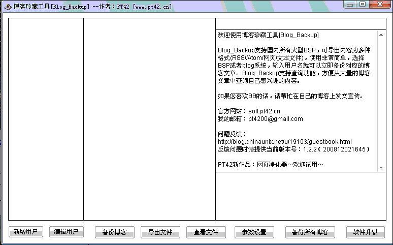 Blog Backup是目前网络上最优秀的一款专业的博客备份工具,它能够支持国内所有大型BSP,可导出内容为多种格式(RSS//Atom/网页/文本文件),使用非常简单,选择BSP或者blog系统,输入用户名就可以立即备份对应的博客文章。如是你拥有多个博客的话,Blog Backup绝对可以帮助到你,可以让你一键同步备份所有的博客,而且不需要输入密码,同时还可以设置代理服务器。