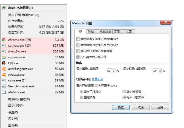 4、高度可定制,可以设置内存使用警告,显示物理内存或Windows页面文件,显示可用或已用内存。