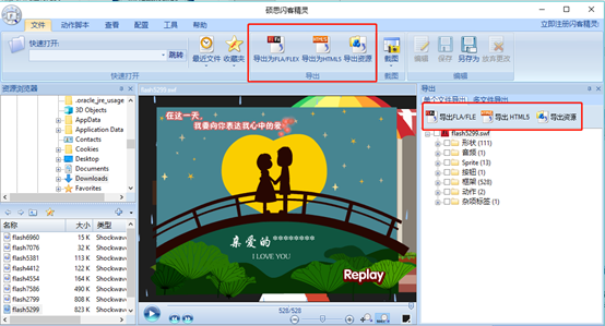 第二种,在硕思闪客精灵的工具栏中也有导出功能,包含导出FLA/FLE按钮、导出HTML5按钮、导出资源按钮,选择需要的按钮进行导出即可。