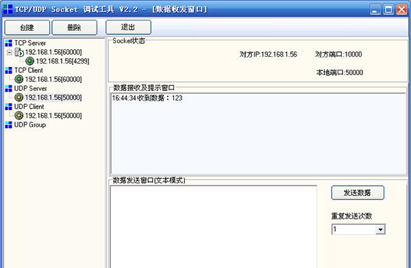 d、当连接建立成功后,就可以进行数据收发的测试了,例如:点中TCP Server方的Socket,,然后在操作面板中输入数据12345,再点击“发送数据”按钮,如下图所示: