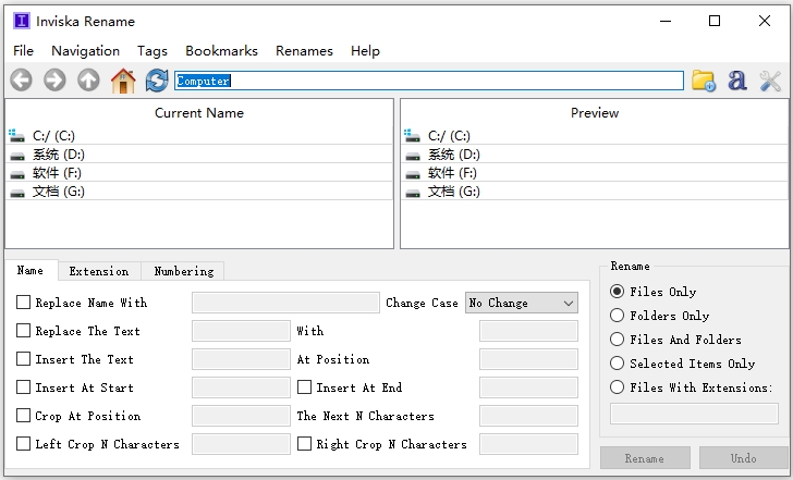 inviska rename是一款专业的文件批量重命名软件,软件可直接重命名成指定文本,支持重命名后统一变成英文大写字符、英文小写字符,在文件名开始处、结尾、指定位置插入连续不断的数字,您也可以指定数字的开始值和步进值,非常的实用。同时这款软件还支持用户使用提供的变量来提取音乐文件、图片文件中的信息,操作非常简单,即使是新手也能轻松驾驭,有需求的用户快来下载体验吧!