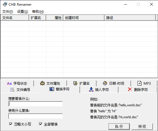 CHB Renamer是一款专业的批量修改文件属性工具,这款软件采用Pascal Script编写复杂逻辑的重命名算法,以任意顺序堆栈多个规则并以此顺序应用,方便了用户对更名后的文件进行复制、移动和删除。另外,CHB Renamer还允许大批量文件进行数字、英文排序,可以根据MP3文件的ID3标签和图像文件的宽、高和文件的大小进行改名,从而免去手工更改的烦琐并且节省大量时间,使您的工作变得更有效率。