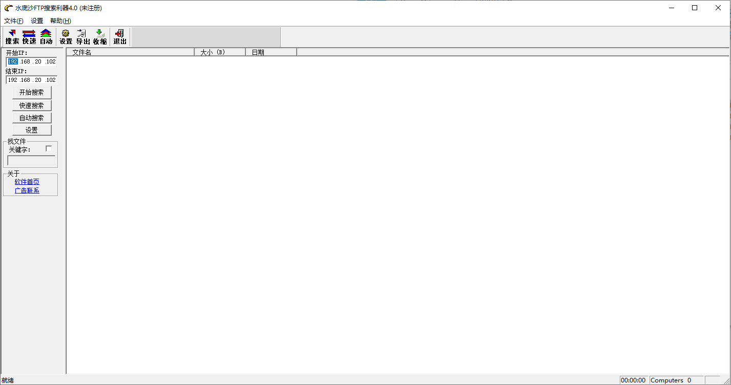 水底沙FTP搜索利器官方版是一款非常好用的FTP搜索软件,该软件体积小巧,使用简单,不仅可以快速的搜索一段IP内的FTP服务器,同时还可以直接搜索一个IP找到你的FTP服务器,并且还可以帮助用户下载FTP服务器上的文件,功能非常强大。