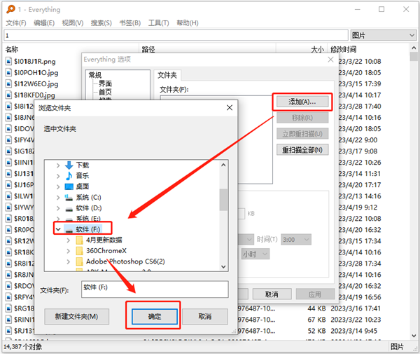 4、打开文件夹选项之后,在右侧页面中,我们点击“添加”选项,然后在浏览文件夹弹框中选择一个磁盘,最后点击“确定”选项即可