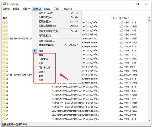 2、打开搜索选项之后,我们在下拉列表中可以看到各种搜索分类,在音频、压缩文件、文档、可执行文件等分类中找到一个自己需要的文件类型点击使用即可。