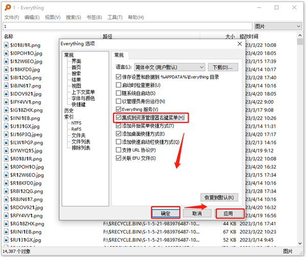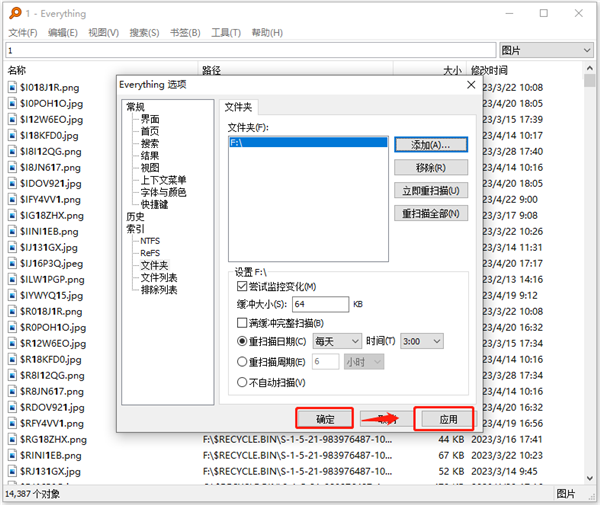 5、回到everything选项页面之后,我们在页面下方点击“应用”和“确定”选项即可