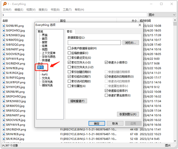2、进入everything选项页面之后,我们在该页面左侧练中找到“索引”选项,点击打开该选项