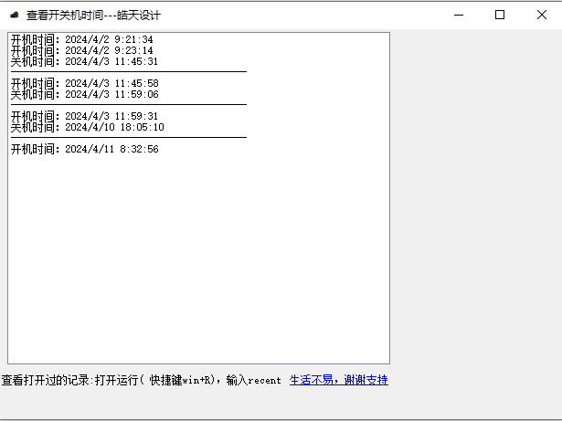 值得一提的是,查看开关机时间工具无需安装,只要下载并解压后即可运行查看自己电脑的所有开关机记录,非常的方便。而且这样也就可以很好的帮助用户用户通过查看电脑开关机的记录来查看自己的上班时间、电脑是否被他人动过、自己的电脑使用记录等信息。