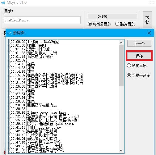 3、双击一首音乐,可打开歌词页,点击保存即可下载歌词
