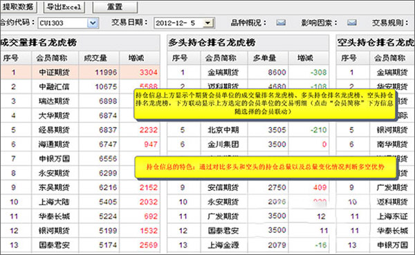 持仓信息上方显示个期货会员单位的成交量排名龙虎榜、多头持仓排名龙虎榜、空头持仓排名龙虎榜,下方联动显示上方选定的会员单位的交易明细(点击“会员简称”下方信息随选择的会员联动)