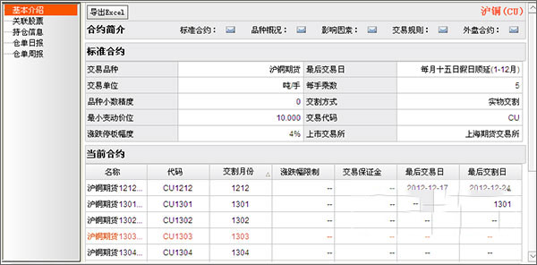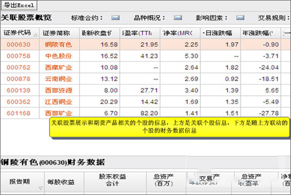 关联股票展示和期货产品相关的个股的信息,上方是关联个股信息,下方是随上方联动的个股的财务数据信息
