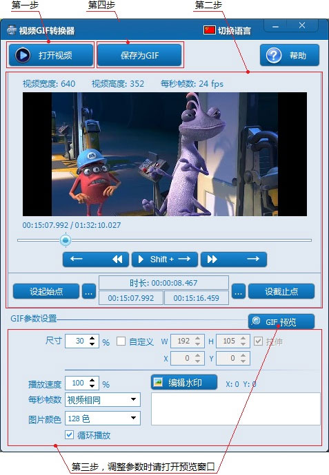 1、为了直观的显示调整各参数后的效果,请点击“GIF预览”按钮,打开预览窗口。