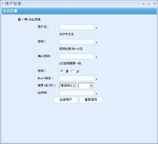 3、点击“注册新用户”,可以打开注册界面。如下图所示:用户名和密码不能超过12位,不能小于6位,且不能出现and或or这样的字符。