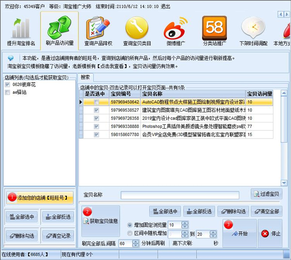 选择“固定增加”或“区间增加”2种方式,然后,点击“开始”按钮,就可以开始刷流量了。工作完成后,双击查询记录可以打开宝贝页面。