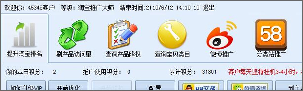5、用户登录后会显示,您的累计积分(默认为1000分)。默认系统登录后,在挂机状态,你的“本日积分”会自动累加。如果点击“开始”按钮,“推广使用积分”开始累计,在使用“开始推广”时候,我们的服务开始为您做推广,同时您的推广积分开始计数,累计积分开始减少,当累计积分减少到“0”的时候,服务器不再为您进行推广。你可以选择继续挂机,而不点击“开始”来累计积分。