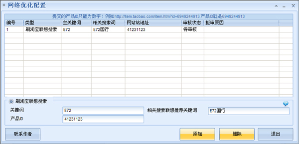 3、登录后点击“配置按钮”,在弹出界面中录入你需要优化的关键词,和物品ID,免费版只能录入3组词,不能录入产品ID。正式版可以录入12对,且支持刷产品排名(注明,本功能随淘宝算法不断变化,可能有时候效果不尽如人意!!)
