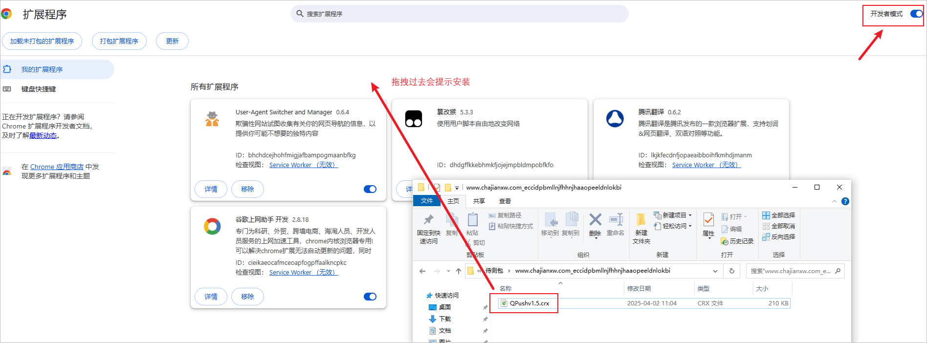 1、首先把需要安装的插件.crx拖拽到扩展程序中心,注意右上角的开发者模式一定要开启;