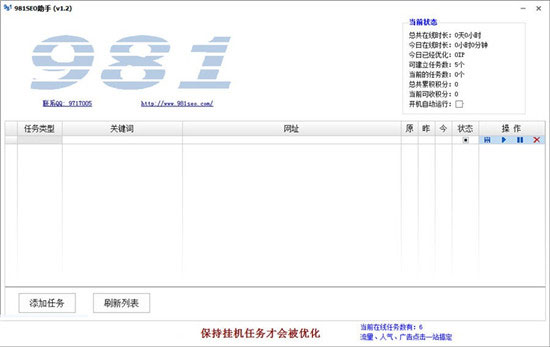 981seo助手官方版是一款专业、高效、免费的网站刷百度排名和刷流量的软件。其主要功能是能够帮助站长朋友们快速提高网站的百度排名/网页流量、网店访问量和商品人气,提升小网站的广告收入。软件操作非常简单,只需1步,马上就可以开始刷流量、排名和人气,效果立竿见影,有需求的用户不妨下载体验!