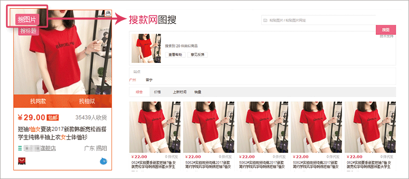 2、支持利用图片及标题搜索相同或相似款式的货源