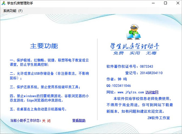 学生机房管理助手是一款功能强大的学校机房管理软件,具备“免费、实用、无毒”等特色,支持保护极域、红蜘蛛、锐捷、联想等电子教室或云课堂,防止学生脱离控制,能够全面保护网络电子教室的运行,并且禁止使用USB设备、禁止使用注册表组策略、禁止使用幽灵网吧辅助冰刃等操作,从而保证学生机房的正常运行。