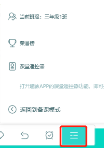 另外点击底部的扩展功能图标,如下图,你可以更换授课班级,关闭荣誉榜以及返回到备课模式。