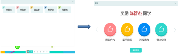 关于课堂奖励方面,您可以点击下方的小拇指按钮,会弹出班级学生姓名,点击某个学生可以奖励表扬该学生,互动效果生动有趣。