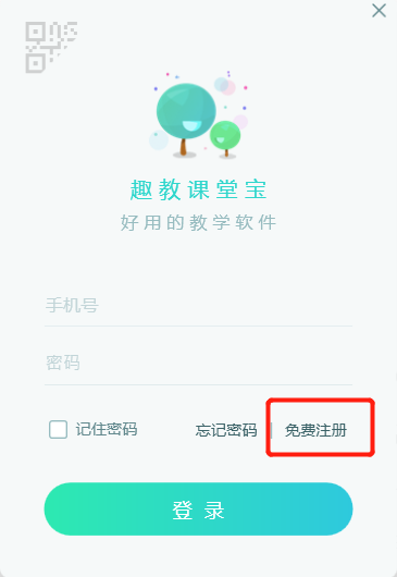 在本站免费下载趣教app,然后使用手机号进行免费注册即可,也可以在趣教课堂宝的登录界面点击右下角的“免费注册"按钮,用手机微信扫描弹出的二维码,下载安装趣教App(手机端)进行账号注册。