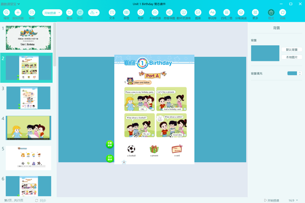 就进入了课件播放界面。进入播放界面后,页面底部的工具栏会默认出现,通过这个工具,您可以拖动播放界面的元素。这些工具可以高效地帮助您上课。你可以利用底部的页码切换面板进行课件页码的更换