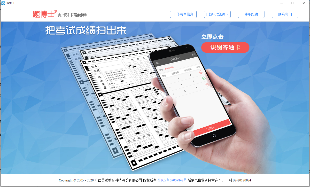题卡扫描阅卷王的使用方法也非常简单,用户只需将标准答案答题卡上传到系统中,系统就能自动进行对错判断,无需人工进行繁琐的阅卷工作,除此之外,题卡扫描阅卷王还具有强大的兼容性。它能够支持jpg、bmp、png、gif四种格式的答题卡图片,无论是哪种格式的图片,都能轻松应对。