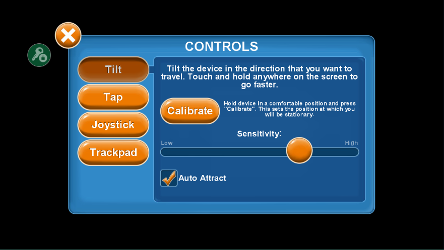 按您想要移动的方向倾斜设备。触摸和按住屏幕上的任何地方去更快,保持设备在一个舒适的位置,并按下“校准”。这将设置您将静止的位置。