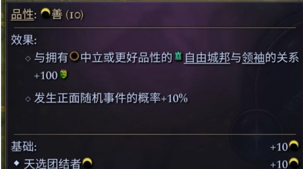 · 天选团结者(chosen uniters)善良:【效果】+10品性、附庸领地+30%收入、持盾单位和长柄武器单位+1牌、+1耳语石;【初始奖励】1个额外的持盾单位或长柄武器单位;【冲突】所有邪恶社会特性。