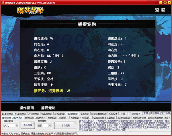 ucbug造梦西游3修改器最新版是由ucbug团队成员针对页游平台《造梦西游3》而设计制作的一款游戏辅助软件,可以帮助玩家快速升级游戏中的各种任务,以达到快速升级的目的,可以让玩家有一个更好的游戏体验。软件拥有一键秒杀无敌、跳跃力增强、无双增加时间、八戒血越得越多、增加物品爆率等多种修改功能,让你在游戏中秒变大神,更轻松的进行游戏体验,有兴趣的朋友欢迎下载体验。
