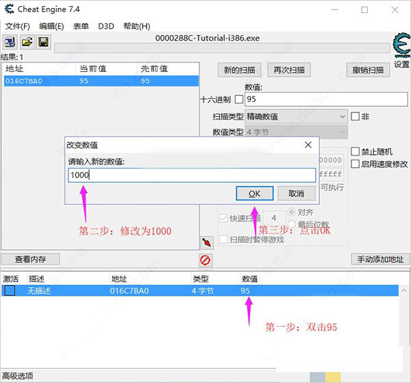 11、在数值95上面双击,并修改把 95 改成 1000 点击确定按钮,此时通关;