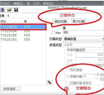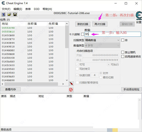 9、我们再输入 95 点击 再次扫描 按钮 结果只剩1个(这就是我们要找的),我们双击此地址将其添加到地址栏;