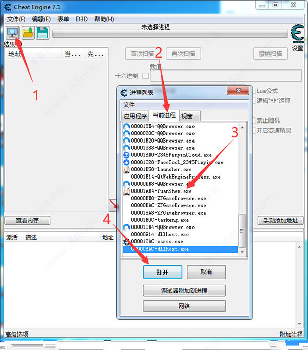 3、选择进程,当前进程,找到游戏的进程,名称是YuanShen.exe,选择这个进程并打开;
