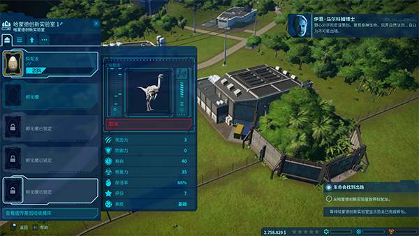 有足够DNA组成可用的遗传基因组后,你就在哈蒙德创新实验室孵化并放养恐龙。