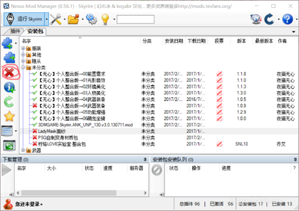 5、要想删除某个mod的话,选中那个mod,点左边的×就可以删除了,要想卸载的话双击mod就可以卸载,但不会删除;