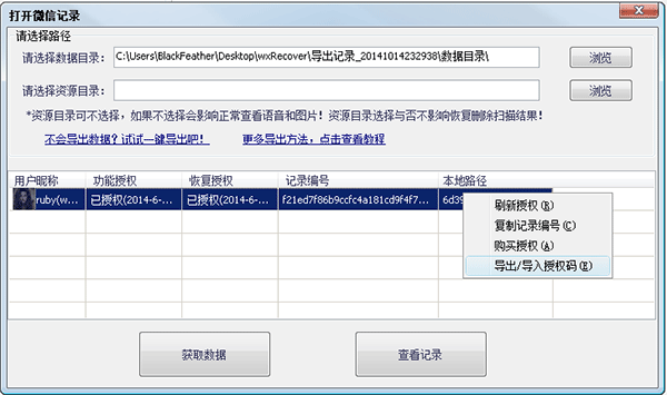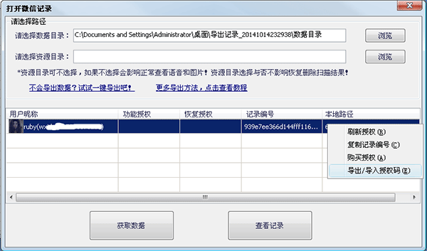 在另一台电脑B,打开同一个微信帐号的数据后,会发现没有授权了,记录编号也变化为:939e7ee366d144fff116f4141c4ccd2d。同样,右键点击此记录并选择导出/导入授权码: