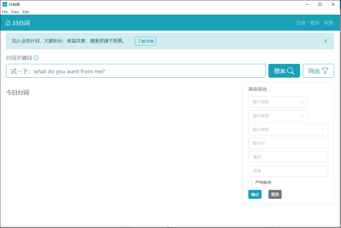 每当在网上看到一句经典台词时又不知道是什么电影的出处?那么现在可以直接利用33台词电脑版来进行搜索查找啦,这是一款可以通过中英文台词找影片素材的小工具,简单的说就想网易云音乐,QQ音乐中的听歌识曲一样的功能,而这里就是搜词找片,十分强大,这样就再也不用担心找不到自己想要的电影或电视剧啦。