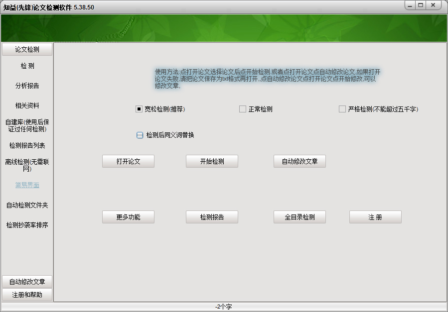 知益(先锋)论文检测软件是一款绿色、实用,功能强大的论文检测软件,软件自带文库,里面收集了多种网络上的论文,可以帮助您检测网络上的文章和您现有文章的区别。其主要的工作方式就是在后台将您的文章与论文库中的文章进行比对,找出重复的内容,并将详细的情况显示的检测报告中,有效的帮助用户增加论文的原创程度;该软件除了检测以外,最大的功能就是文章的自动修改了,当检测出重复的部分,您可以直接交给软件进行更改,不需要您在手动编辑文本了,非常方便,极大的提高了您文章的质量。